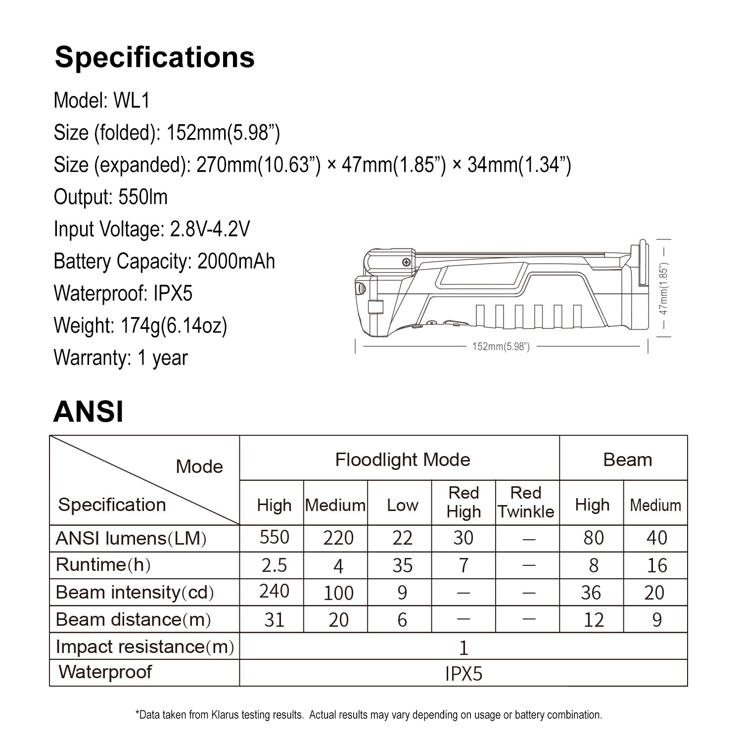 Klarus 550 Lumen Rechargeable Lithium-ion Working Light WL1